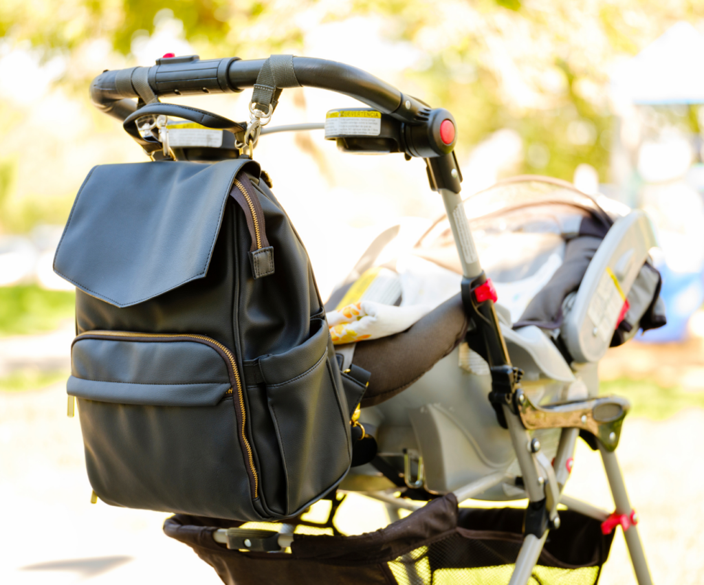 When looking for a bag, consider a crossbody or backpack that easily comes on and off, provides quick access to the item you’re looking for, provides a built-in changing pad, and has multiple compartments to keep things organized.