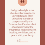 “(Feel good weight) is not about conforming to the unrealistic and often unhealthy standards perpetuated by the ‘bounce-back’ culture but about embracing the weight that makes you feel healthy, confident, and at peace with your body.”