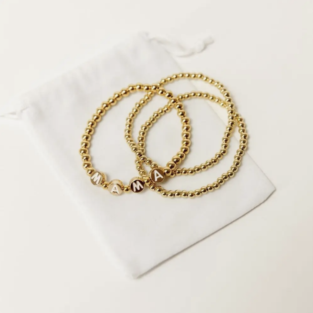 This 18-karat gold-plated set of three bracelets is a sweet and classy way to sport her newest nickname, Mama. Each brass bead is plated in 18k gold and hand strung with love. The set of 3 comes with a velvet carrying pouch and care instructions.