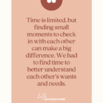 Time is limited, but finding small moments to check in with each other can make a big difference. We had to find time to better understand each other’s wants and needs.
